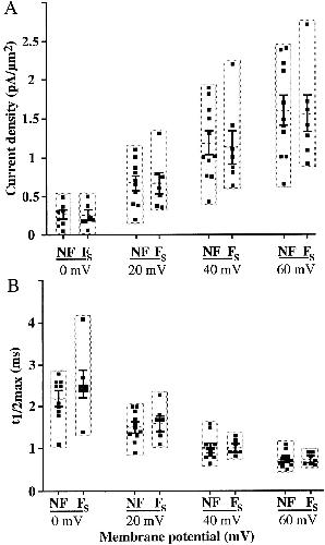 Injection of xKv3.1 sense RNA into a single blastomere of two-cell stage embryos has no effect on the expression of I Kv in cultured neurons.A, Current densities of FS and NF neurons are not different. B, Times to half-activation of FS and NF neurons are not different. Conventions are as in Figure 4; n = 18. |