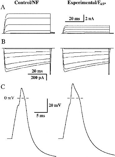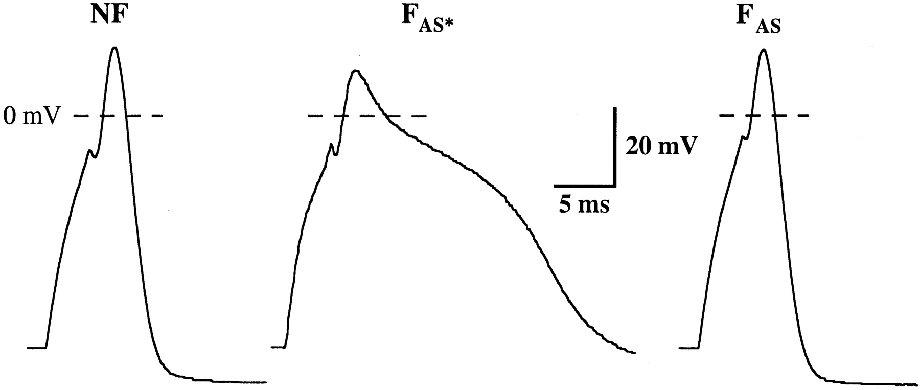xKv3.1 AS increases action potential duration. The AP of FAS* neurons is longer in duration than that of NF and FAS neurons (p < 0.01), consistent with reduction of the amplitude of I Kv. The records are from three neurons at 1 d in culture; n = 24. |