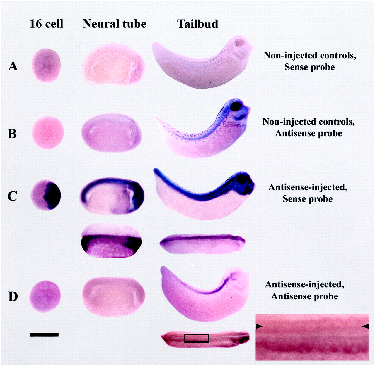 Inhibition of expression of xKv3.1transcripts by antisense RNA injection is visualized by in situ hybridization of whole-mount Xenopus embryos with a xKv3.1-specific antisense probe. A, Sense (S) probe gives no signal in uninjected control embryos. B, AS probe reveals that endogenous xKv3.1 mRNA is present in the spinal cord of control embryos at stage 22 and thereafter (Gurantz et al., 2000).C, S probe labeling of AS-injected embryos demonstrates stability of injected xKv3.1 AS. Signal is observed in 16-cell through stage 30 embryos; dorsal view of another embryo indicates that only the injected side of the embryo (top) contains AS. D, Injection of xKv3.1 AS reduces the endogenous signal detected with the AS probe. Dorsal view of another embryo indicates that reduction of the in situ hybridization signal is restricted to the injected side (top, arrowheads). Area inbox is enlarged at right. For all embryos anterior is to the right and dorsal isup. Scale bar, 1 mm. Black spots on tailbud embryos are melanocytes. |