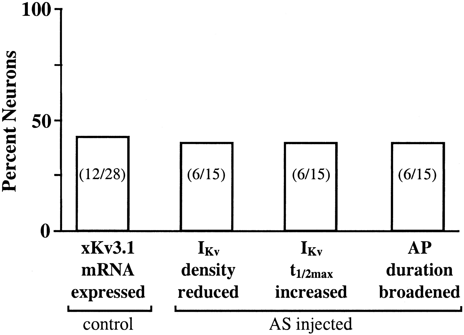 The percentage of neurons in whichI Kv and APs are affected byxKv3.1 AS is similar to the percentage of neurons previously shown to express xKv3.1 transcripts (Gurantz et al., 2000). Numbers in parenthesesindicate the number of neurons affected/tested for each condition. |