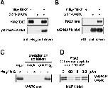 Complex formation between Rsk2 and p42 MAPK. A, p42 MAPK is pulled down with Rsk2. Lysates from Sf9 cells expressing either His6-Rsk2 or GST·MAPK were combined and incubated at 4 °C for 90 min with protein G-agarose beads and anti-His6 antibodies, both individually and together. His6-Rsk2 and any Rsk2-associated proteins were pulled down with anti-His6antibodies. The immunoprecipitates were then immunoblotted for Rsk2 and p42 MAPK. B, Rsk2 was pulled down with p42 MAPK. Lysates from Sf9 cells expressing His6-Rsk2 or GST·MAPK were combined with glutathione-agarose beads both individually and together and processed as in A. C, binding of endogenous Xenopus p42 MAPK to His6-Rsk2. G2 phase Xenopus oocyte lysates were incubated for 20 min at 4 °C in the presence or absence of purifiedXenopus His6-Rsk2 protein. These lysates were then incubated with protein G-agarose beads in the presence and absence of anti-His6 antibody and incubated for 90 min at 4 °C. The first lane represents the total lysate used in each immunoprecipitation. After centrifugation and washing, the beads were resuspended in sample buffer and resolved by 10.5% SDS-PAGE, followed by p42 MAPK immunoblotting. D, Xenopus egg extracts containing both phosphorylated and unphosphorylated MAPK were treated similarly to C except that lysates were preincubated in the presence or absence of a Rsk2 C-terminal peptide for 10 min at 22 °C prior to adding His6-Rsk2 protein. Beads were collected by centrifugation, washed, and processed as inC.