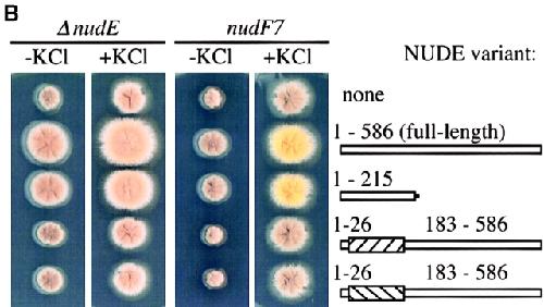 Figure 1. (A) Suppression of nud mutants by extra copies of the nudE and nudF6 genes. The indicated mutants (all are conditional, temperature sensitive) were transformed with either the empty vector pAid or pAid clones bearing nudE and nudF6 genes (plasmids recovered in the multicopy suppressor screen) and grown at 32°C. Transformants were gridded on YAG plates with or without KCl and incubated at 43°C or 32°C for 2 d. All strains have different color of conidia: yellow for nudF7, green (wild-type) for nudF6, chartreuse for nudA1, and white for nudC3. The intensity of the colony color is proportional to the number of conidia produced. Four independent transformants of the nudF7 mutant are shown for each plasmid to demonstrate reproducibility of phenotypes. (B) Complementation of the nudE deletion and the nudF7 mutant by extra copies of nudE, the nudE NH2-terminal domain, and nudE chimeras carrying coiled-coil regions from human and frog proteins, respectively. Strains were transformed with nudE variants in pAid vector and grown at 43°C. Numbers refer to amino acid residues of NUDE protein expressed by the constructs (see Fig. 3 for detailed amino acid sequences). Due to the presence of a fawn color marker, conidiating and unconidiating ΔnudE colonies have very similar colors at this temperature.