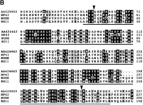 Figure 3. (A) Homology between A. nidulans NUDE protein and N. crassa RO11 protein. Shaded residues are predicted to form a coiled-coil structure. The probabilities of coiled-coil formation are 0.9–1 for the NH2-terminal region and 0.7–0.8 for the central region. Probabilities of coiled-coil formation were calculated using program COILS version 2.1 (MTIDK matrix, unweighted a and d positions, window = 28) at http://www.ch. embnet.org/software/COILS_form.html (Lupas et al. 1991). Assigning 2.5-fold weights to a and d positions slightly changes the probabilities at coiled-coil ends and increases probability for the central coiled-coil to 0.9–1. (B) Alignment between coiled-coil regions of an ORF predicted from human EST with GenBank accession number AA424443, X. laevis MP43 (accession number U95097), A. nidulans NUDE (accession number AF085679), and N. crassa RO11 (accession number AF015560). The underlined residues are predicted to form coiled-coil structure with probabilities >0.9. The regions between arrowheads were used in sequence exchange experiments to test if human or X. laevis coiled-coil regions can substitute for the NUDE coiled-coil. The percentages of identical (similar) residues for the underlined coiled-coil regions are 69% (82%) between NUDE and RO11, 38% (51%) between NUDE and AA424443, 39% (51%) between NUDE and MP43, 72% (83%) between AA424443 and MP43, 40% (52%) between RO11 and MP43, 40% (52%) between RO11 and AA424443.
