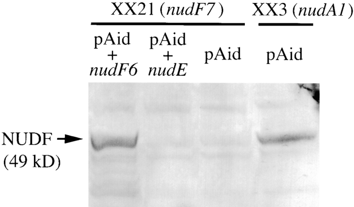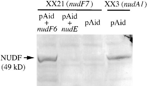 Figure 2. Extra copies of the nudE gene do not change the level of NUDF protein in the nudF7 mutant. Total protein extracts were prepared from nudF7 and nudA1 mutants carrying indicated plasmids and NUDF protein levels were analyzed by Western blotting with the anti-NUDF antibody. Strains were grown at 43°C in YG medium. A nudA1 mutant was included as a control of the wild-type level of NUDF. The amount of NUDF protein in the nudF6 mutant is less than in nudF7 (Xiang et al. 1995a).