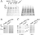 Figure 5. NUDE protein tagged with VSV-G epitopes coprecipitates with NUDF in A. nidulans protein extracts. (A) Total protein extracts from four independently isolated NUDE::(VSV-G)6 strains (#8, 12, 15, 17) and the parent strain with the wild-type nudE gene were analyzed by SDS-PAGE (4–20%) and immunoblotting with P5D4 antibody (left). Ponceau S staining of the membrane after protein transfer is shown on the right. (B) Same samples as in A (tagged strain #17 and untagged control) after better separation on a 10% SDS-PAGE. (C) The left panel shows immunoblotting of proteins precipitated by P5D4 antibodies coupled to Sepharose beads from nudE::(VSV-G)6 and nudE+ extracts with P5D4 and anti-NUDF antibodies. The right panel shows silver staining of the same samples.