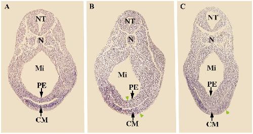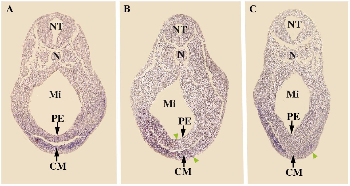 cardiogenic mesoderm; NT, neural tube; Mi, midgut; N, notochord; PE, pharyngeal endoderm. |