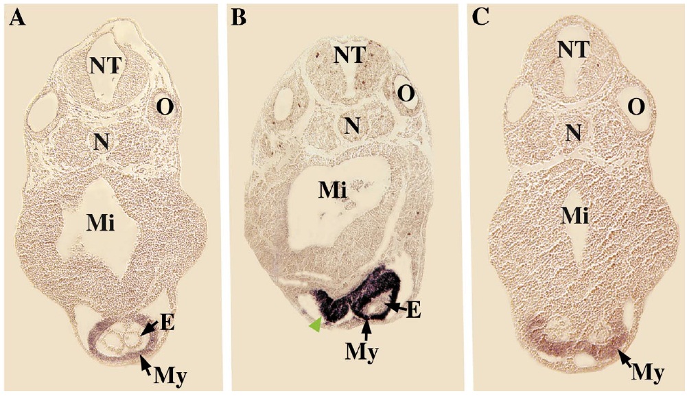 mRNAs was relatively weak, yet specific staining was observed. Cardiogenic regions are indicated by black arrowheads (for reference,