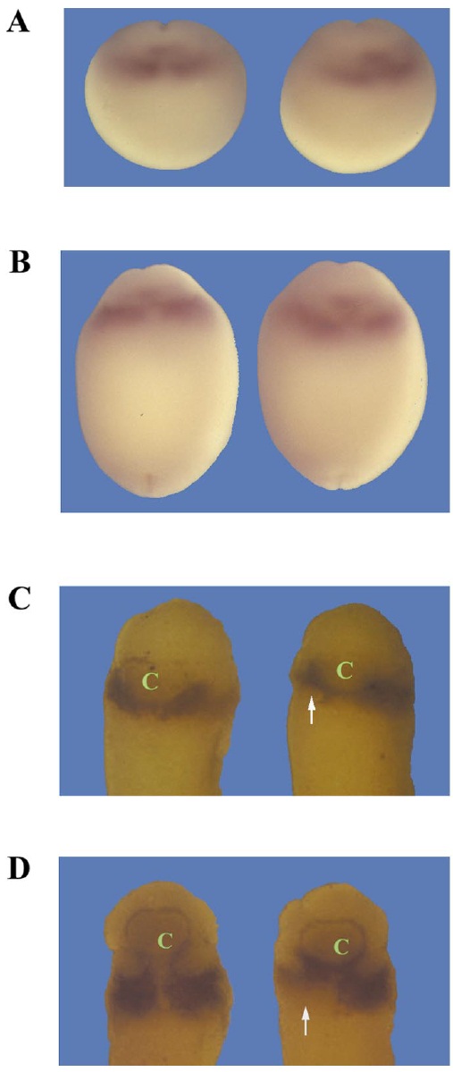 embryos harvested from stages 14 through 20 exhibited normal XNkx2-5 expression, as represented in A and B. Embryos from