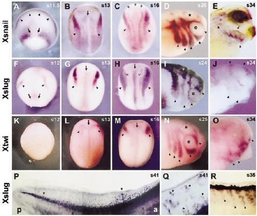 Xsnail and Xslug. Arrows show the mesodermal expression of the genes from late gastrula to late neurula stages. Note the complementary