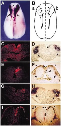 fluorescent images of the sections showing the in situ hybridization for the Xslug gene in D, F, H, and J. Arrows, Xslug expression in the