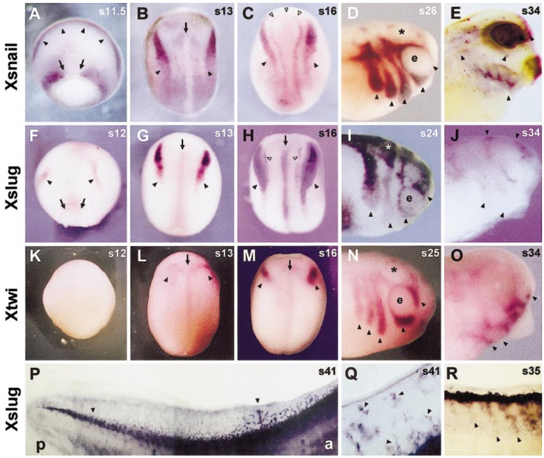 I, and N; e, eyes). Neural crest migrating into the dorsal fin is revealed by Xslug expression (P) at tailbud stages. There was a marked