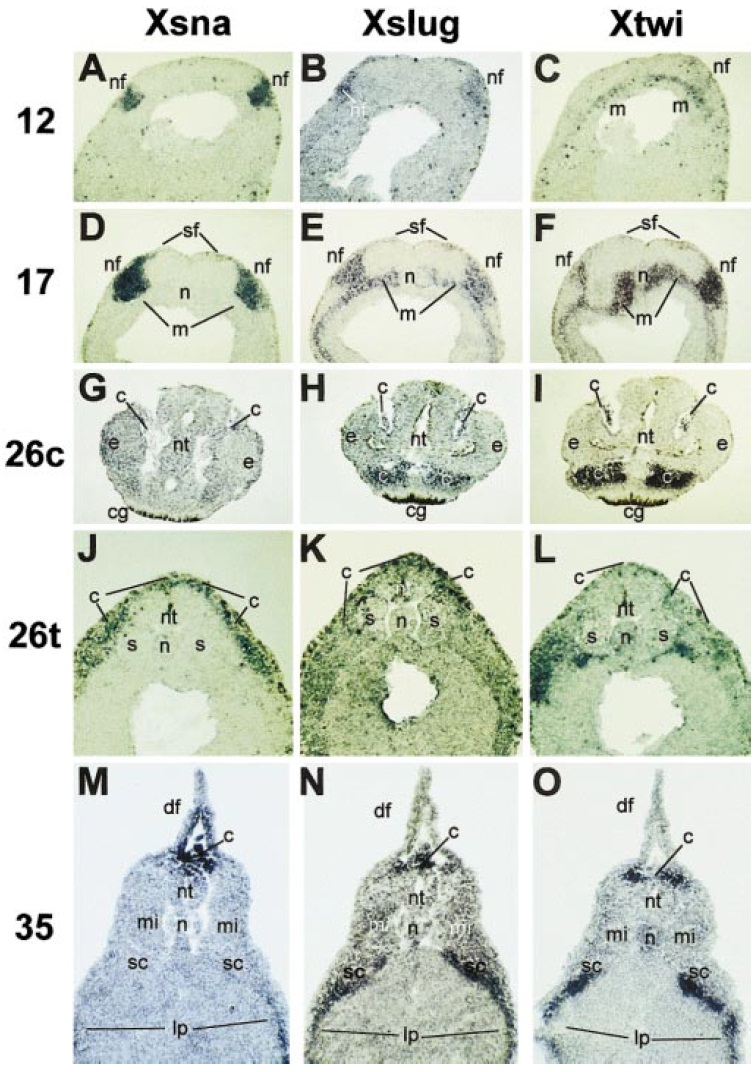 FIG. 2. In situ hybridization in serial sections for Xsnail, Xslug, and