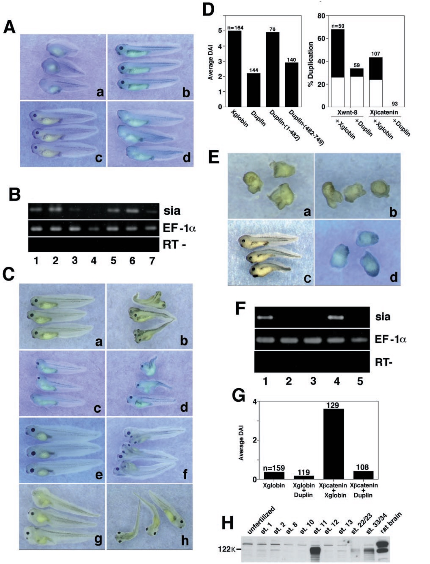 beta-Catenin is efficiently phosphorylated by glycogen synthase kinase-3beta in the Axin complex in the cytoplasm, resulting in the down-regulation. In response to Wnt, beta-catenin is stabilized and translocated into the nucleus where it stimulates gene expression through Tcf/Lef. Here we report a novel protein, designated Duplin (for axis duplication inhibitor), which negatively regulates the function of beta-catenin in the nucleus. Duplin was located in the nucleus. Duplin bound directly to the Armadillo repeats of beta-catenin, thereby inhibiting the binding of Tcf to beta-catenin. It did not affect the stability of beta-catenin but inhibited Wnt- or beta-catenin-dependent Tcf activation. Furthermore, expression of Duplin in Xenopus embryos inhibited the axis formation and beta-catenin-dependent axis duplication, and prevented the beta-catenin's ability to rescue ventralizing phenotypes induced by ultraviolet light irradiation. Thus, Duplin is a nuclear protein that inhibits beta-catenin signaling.