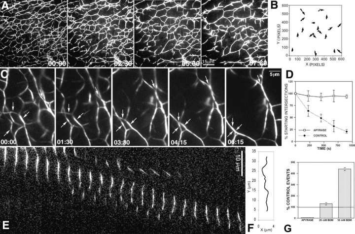 Figure 1. Microtubule-independent F-actin motility in Xenopus egg extracts. (A) Low magnification, time-lapse view of an Alexa 488 phalloidin-stained F-actin network formed in the presence of nocodazole (10 μM). The number of F-actin bundles decreases and their thickness increases over time as bundle zippering results in annealing of adjacent bundles. (B) Trajectory plot of the position of F-actin bundles in a time-lapse series of 600 × 600 pixel images. Time points are separated by 15 s; arrowheads indicate the direction of movement in final frame. Most of the bundles move only short distances and display no consistent direction of movement. (C) High magnification, time-lapse view of F-actin bundle zippering. Adjacent bundles (arrows) zipper together at intersections, resulting in the formation of larger bundles and a decrease in the number of intersections. (D) Depletion of ATP by apyrase treatment (10 μg/ml) of extracts blocks F-actin zippering. The number of intersections between adjacent F-actin bundles was quantified in extracts at various times after the initiation of imaging in the absence (control) and presence (apyrase) of apyrase. In the absence of apyrase, the number of intersections decreases over time; in the presence of apyrase the number of intersections fails to decrease and the networks did not change over time. Data shown are mean ± SEM; n = 2. (E) High magnification, time-lapse view of F-actin bundle serpentine gliding. The F-actin bundle moves sinuously across the substrate. Images in successive panels were acquired at 15-s intervals. (F) Plot of the X-Y coordinates of the point of peak fluorescence intensity of the F-actin bundle shown in E. This demonstrates the serpentine path followed by the F-actin bundle. (G) Serpentine gliding is prevented by depletion of ATP with apyrase and is stimulated by BDM. The number of gliding events per field of view in samples subjected to the indicated treatment was compared with the number of events in control samples from the same experiment. Apyrase almost completely eliminated serpentine gliding. BDM at 20 mM had a slight stimulatory effect, while BDM at 50 mM more than tripled the number of bundles moving by serpentine gliding. Data shown are mean ± SEM; n = 2. Time is in min/s. Also see supplemental videos 1–3 at http://www.jcb.org/cgi/content/full/150/2/361/DC1. |
