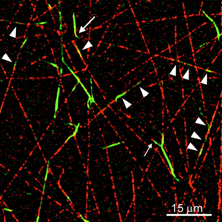Figure 4. F-actin bundles form lengthwise associations with microtubules. Double label images of microtubules obtained from time-lapse movies were digitally processed to remove the background of unpolymerized fluorescent label in the extract, color encoded, and combined into an RGB overlay to reveal the codistribution of the two polymers. Microtubules are randomly arrayed on the coverslip surface. Some F-actin is not associated with microtubules, but a substantial amount is aligned lengthwise along microtubules (arrowheads). Occasionally, ends of F-actin bundles terminate on the side of microtubules (large arrow) and microtubule and F-actin bundles can associate end-to-end (small arrow). |