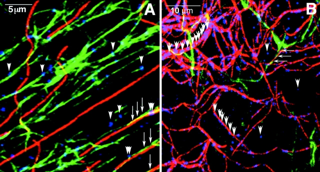 Figure 9. Localization of myosin-IIA and -V in Xenopus egg extracts. (A) Triple label fluorescence analysis of myosin-IIA (blue), microtubules (red), and F-actin (green) in rapidly frozen extracts. Myosin-IIA punctae (arrowheads) are found predominantly on F-actin bundles. In some regions, myosin-2, microtubules, and F-actin are colocalized (triple arrowheads); in other regions, F-actin and microtubules are colocalized in the absence of myosin-2 (arrows). (B) Triple label fluorescence analysis of myosin-V (blue), microtubules (red), and F-actin (green) in rapidly frozen extracts. Most of the myosin-V (arrowheads) is found on microtubules or the substrate. In both A and B colocalization of red, blue and green result in white. |