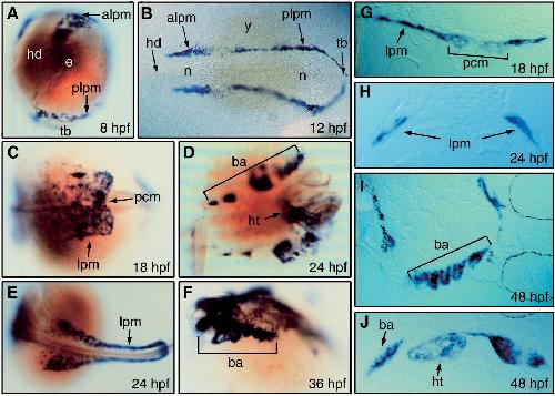 dHAND expression in staged zebrafish embryos. Whole-mount in situ hybridization (AâF) revealed expression of dHAND in the lateral plate mesoderm (lpm), pre-cardiac mesoderm (pcm), branchial arches (ba) and in the heart (ht). As early as 8 h post fertilization (hpf), expression was evident circumferentially in the anteriorlateral plate mesoderm (alpm) and posteriorlpm (plpm) in an oblique head-on view (A); positions of head (hd), eye (e) and tailbud (tb) are shown. At 12 hpf expression was again seen in the alpm and plpm (B); embryo is oriented with the head to the left and the tailbud to the right. Notochord (n) and yolk (y) are also noted. Expression in the pcm became evident at 18 hpf (C) and persisted into the heart tube at 24 hpf (D) seen ventrally, when branchial arch expression also became apparent. The embryo at 24 hpf demonstrated bilaterally symmetric expression of dHAND in the lateral plate mesoderm (E) in a dorsal view of the caudal region. Branchial arch expression persisted at 36 hpf (F) in the rostral region as seen dorsally. Transverse sections of 18 (G) and 24 (H) hpf embryos in the rostral and caudal regions, respectively, confirmed expression in the pcm and lpm. (I) demonstrates branchial arch expression of zdHAND at the histological level. (J) Shows expression of zdHAND throughout the heart tube.