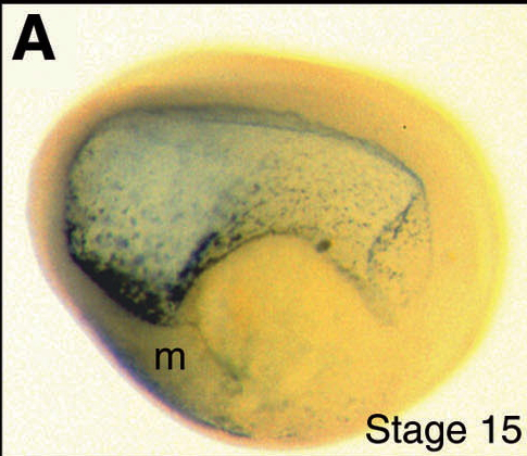 hand1 (heart and neural crest derivatives expressed 1 ) gene expression in bisected Xenopus laevis embryo, mid-sagittal section, assayed via in situ hybridization, NF stage15, anteriorleft.