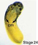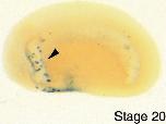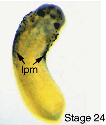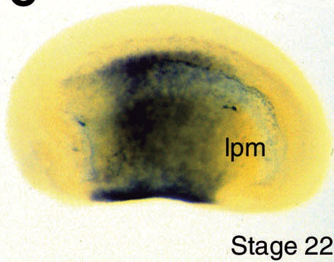 hand1 (heart and neural crest derivatives expressed 1 ) gene expression in Xenopus laevis embryo, assayed via in situ hybridization, NF stage 22, lateral view, anteriorleft, dorsal up.