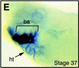 hand1 (heart and neural crest derivatives expressed 1 ) gene expression in Xenopus laevis embryo, assayed via in situ hybridization, NF stage 33, lateral view, anteriorleft, dorsal up.