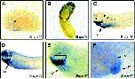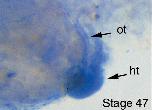 Fig. 3. dHAND expression in staged Xenopus embryos. Whole-mount in situ hybridization in Xenopus embryos revealed dHAND expression in punctate subepidermal cells (arrowheads) as early as stage 20 (A). The punctate cells later appeared to be migrating to the branchial arches and heart (C). dHAND expression was observed in the branchial arches throughout their development (CâE). dHAND was expressed bilaterally in the lateral plate mesoderm (lpm) at stage 24 through stage 33 (BâD). High magnification of the anteriorembryo better demonstrated expression in the looped heart tube and branchial arches at stage 37 (E). Even higher magnification of the cardiac region (F) demonstrated expression in the heart tube (ht) and outflow tract (ot) at stage 47 without any chamber restriction.