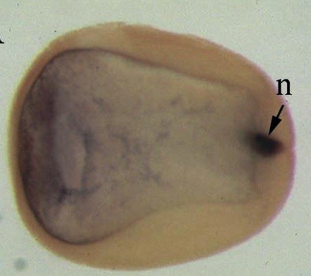 tgfb1 (transforming growth factor, beta 1) gene expression in Xenopus laevis embryo, assayed via in situ hybridization, NF stage 14, dorsal view, anteriorleft.