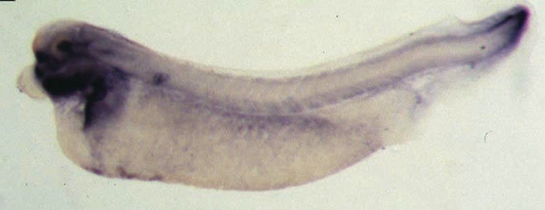 tgfb1 (transforming growth factor, beta 1) gene expression in Xenopus laevis embryo, assayed via in situ hybridization, NF stage 27, lateral view, anteriorleft, dorsal up.