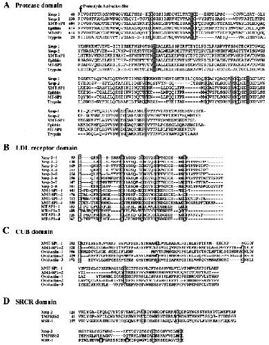 Multiple sequence alignments of the structural motifs. (A) Alignment of the serine protease domains of Xesp-1, Xesp-2, and XMT-SP1 with Epithin, MT-SP1, and Trypsin. The catalytic triad residues (His, Asp, Ser) are in black. The residues of the substrate binding pocket are in gray. (B) Alignment of the LDL receptor domains of Xesp-2 and XMT-SP1 with MT-SP1. (C) Alignment of the CUB domains of XMT-SP1 with oviductin. (D) Alignment of the SRCR domain of Xesp-2 with TMPRSS2 and mouse macrophage scavenger receptor type I. (A–D) The boxes indicate the conserved Cys residues.