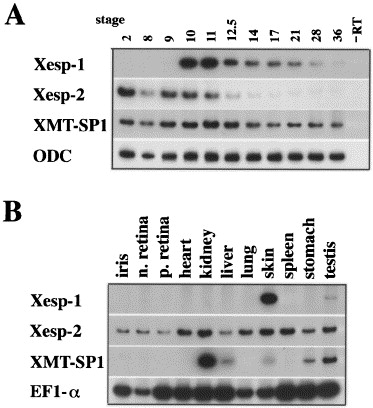 The mRNA expression patterns of Xesp-1, Xesp-2, and XMT-SP1 in embryonic development (A) and adult tissues (B) analyzed by RT–PCR. ODC and EF1-α were used as internal controls.