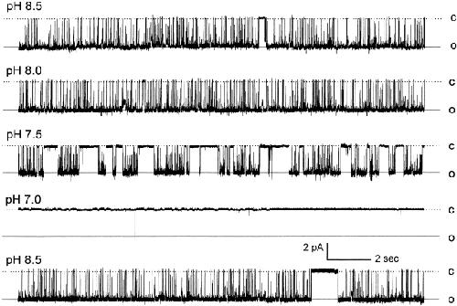 Figure 5. Concentration-dependent inhibition of single-channel activity by low pH. Single-channel currents were recorded from an inside-out patch using symmetric concentrations of K+ (150 mM) on both sides of the patch. At Vm of −80 mV, one active channel was seen at pHi 8.5, which had a Popen 0.934. No detectable change in channel activity was found at pH 8.0 (Popen 0.935). Channel activity decreased at pH 7.5 (Popen 0.548) and was almost completely inhibited at pHi 7.0 (Popen 0.001). Channel activity resumed to the baseline level (Popen = 0.899) after washout. C, closure; O, opening.