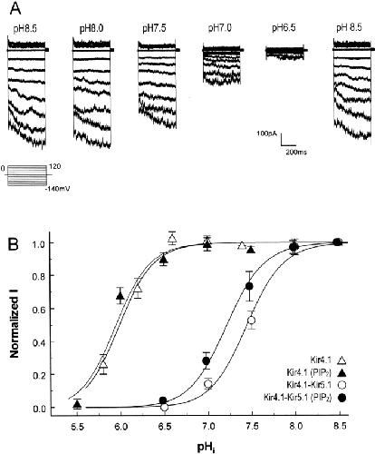 Figure 4. Effects of pHi on macroscopic Kir4.1–Kir5.1 currents. (A) Kir4.1–Kir5.1 currents were recorded from a giant patch with equal concentrations of K+ (150 mM) on either side of the membrane. Inward-rectifying currents were seen at pH 8.5 using command potentials from −140 to 120 mV in 20-mV increments. When pH in the internal solution was reduced to 7.5, these currents were inhibited by ∼60%. Further decreases in pHi caused strong inhibitions of these currents. Inward-rectifying currents were almost totally suppressed at pH 6.5. Washout led to a recovery of these currents to the baseline level. (B) The relationship of Kir4.1–Kir5.1 currents with pHi. These currents are inhibited at pH 7.5, augmented at pH 8.0, and completely shut off at pH 6.5. The relationship of currents (I) to pHi can be expressed using the Hill equation (solid line): I = 1/[1 + (pKa/pHi)h], where pKa is the midpoint pH value for channel inhibition and h is the Hill coefficient. The pKa and h here are pH 7.45 and 2.3, respectively. In comparison, the Kir4.1 was inhibited at much lower pH levels, with pKa 5.99 and h 2.0. The pH sensitivity of Kir4.1–Kir5.1 but not homomeric Kir4.1 was modulated by PIP2. In the presence of 10 μM PIP2, its titration curve was shifted leftward by 0.22 pH U.
