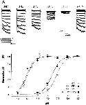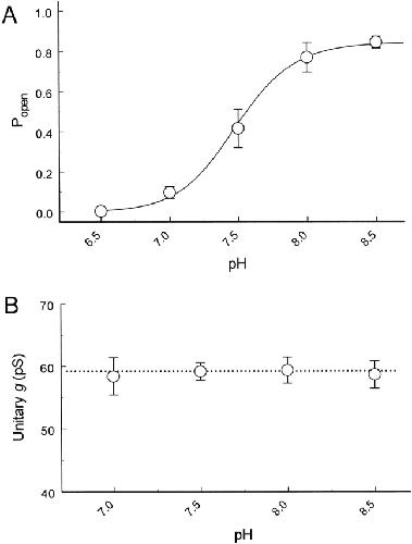 Figure 6. Effects of intracellular pH on Popen and single-channel conductance. (A) At pHi 7.5, the channel Popen is only about a half of its value at pHi 8.5 (average Popen 0.846). The Popen reaches almost its maximum level at pHi 8.0, and becomes nearly zero at pHi 6.5. The relationship of Popen versus pHi can be expressed with the Hill equation (solid line). The pKa (the midpoint of the channel inhibition) and h (the Hill coefficient) are pH 7.48 and 2.3 (n = 6), respectively. (B) In contrast to Popen, single-channel conductance retains at ∼59 pS and does not change with pH levels. Data are presented as means ± SEM.