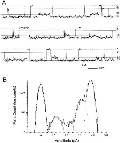 Figure 7. Lack of effect of protons on substates of conductance. (A) Single-channel Kir4.1–Kir5.1 current was recorded from the same inside-out patch as Fig. 2 at pH 7.5. Two substate conductances were still seen with peaks at ∼1/4 and 3/4 of full openings, even though Popen was reduced 0.488 at such a pH level. C, closure; S1, substate 1; S2, substate 2. (B) All-point histogram of the current shows opening, closure, and two sublevels of conductance with each peak at 0.0, 1.18, 3.10, and 3.81 pA, respectively.