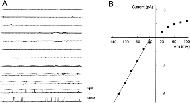 Figure 1. Single-channel conductance of Kir4.1–Kir5.1. (A) Single-channel current was recorded from an inside-out patch using symmetric concentrations of K+ (150 mM) on both sides of the patch membrane at various membrane potentials (Vm). An active channel is seen with a clear inward rectification at hyperpolarizing Vm. Solid line, opening; dotted line, closure. (B) Single-channel conductance calculated from the channel in A is linear at Vm = −40 to −120 mV. The straight line represents a slope conductance of 59 pS.
