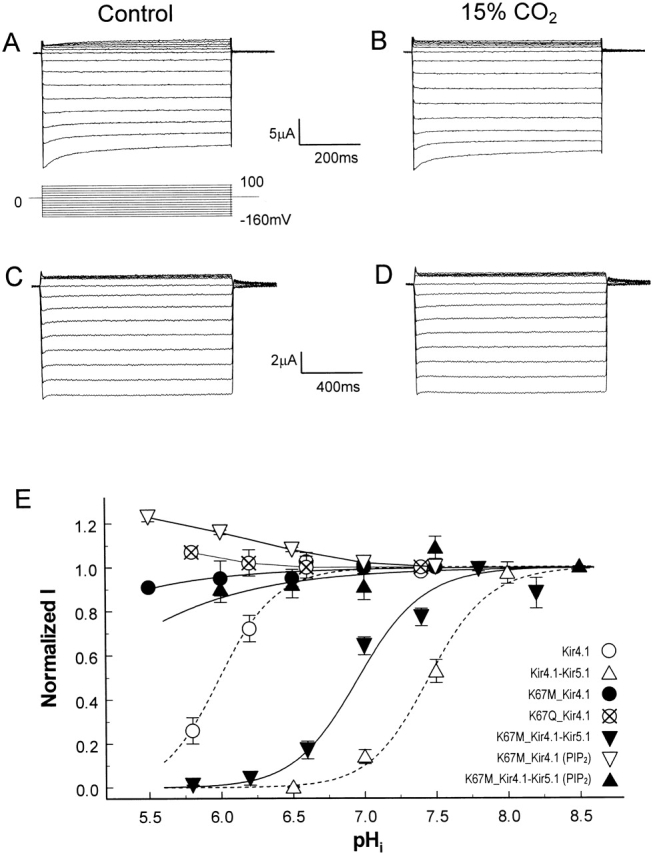 Figure 8. Effects of Lys67 mutation on CO2 sensitivity of Kir4.1 and Kir4.1–Kir5.1 currents. (A) Whole-cell currents were recorded from oocytes. Inward-rectifier K+ currents were seen in an oocyte that had received an injection of K67M mutant Kir4.1. (B) Although the K67M mutation did not affect the baseline currents, channel sensitivity to 15% CO2 (5 min) was abolished. (C) The K67M Kir4.1 was created on a tandem dimer of Kir4.1–Kir5.1, the Kir4.1–Kir5.1 currents were observed 3 d after the injection. (D) These Kir4.1–Kir5.1 currents lost their hypercapnic sensitivity, as no evident change in the current amplitude was seen after 7 min exposure to 15% CO2. (E) Titration curves of Lys67 mutations on Kir4.1 and on a tandem dimer of Kir4.1–Kir5.1. While the Lys67 mutations abolished pHi sensitivity of Kir4.1, the Kir4.1–Kir5.1 with this mutation remained pHi sensitive (pKa 6.95, h 2.2). In the presence of 10 μM PIP2, however, Kir4.1–Kir5.1 carrying the K67M mutation lost its pHi sensitivity.