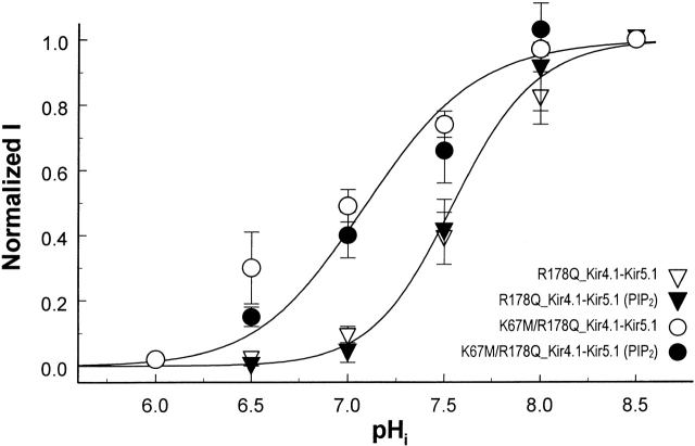 Figure 9. Mutation of Arg178 in Kir5.1 eliminated the effect of PIP2 on channel sensitivity to pHi. In the tandem dimer of Kir4.1âKir5.1, site-specific mutations were made at Lys67 in Kir4.1 and Arg178 in Kir5.1. Inward-rectifying currents were then studied in inside-out patches in the absence or presence of PIP2 (10 μM). The R178Q mutant showed pHi sensitivity similar to the wild-type Kir4.1âKir5.1 with pK 7.50. Its pHi sensitivity was identical with or without PIP2 in the internal solution. The double mutant (K67M/R178Q) showed the pHi sensitivity (pK 7.15) similar to the Kir4.1âKir5.1 with a single K67M mutation. Such pH sensitivity was not affected by PIP2.