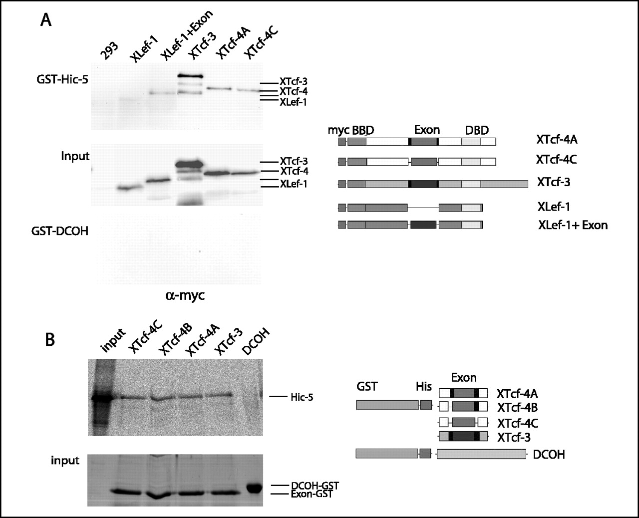 The conserved exon in LEF/TCF is the binding domain for HIC-5. A, recombinantly expressed GST-mHIC-5 was immobilized on glutathione-Sepharose and incubated with cell lysates from HEK293 cells transfected with the indicated Myc-tagged LEF/TCF constructs. Samples were analyzed by Western blotting with Myc epitope-specific monoclonal antibody 9E10 for the presence of the transfected constructs. GST-DCOH served as a negative control. BBD, β-catenin-binding domain; DBD, DNA-binding domain. B, recombinantly expressed exons of XTCF-3 and XTCF-4 were immobilized on glutathione-Sepharose and incubated with in vitro translated 35S-labeled mHIC-5. Upper panel, autoradiograph; lower panel, same gel stained with Coomassie Blue to demonstrate equal loading.