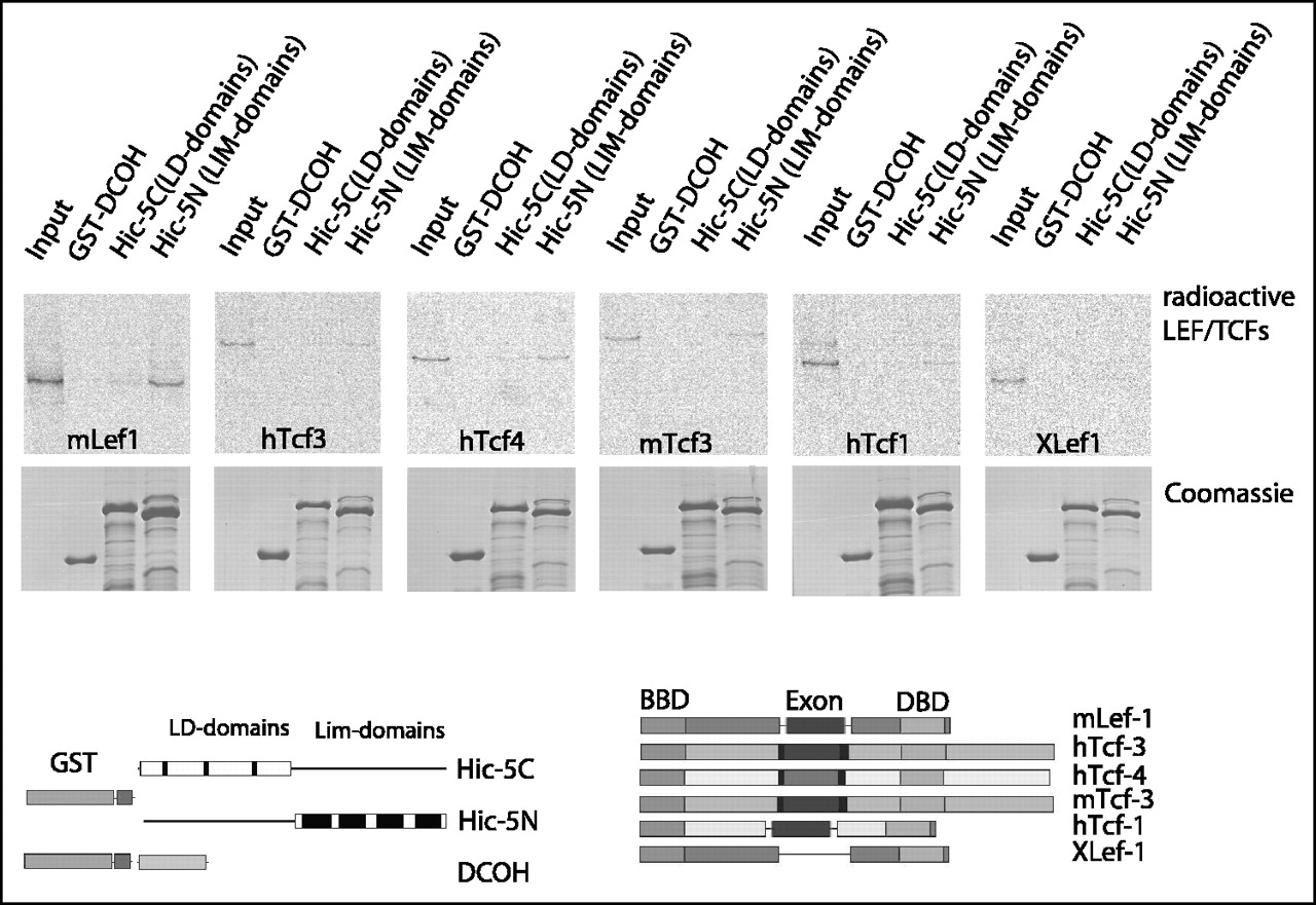 LEF/TCF proteins bind to the LIM domain-containing C-terminal half of HIC-5. The recombinantly expressed C-terminal half (GST-HIC-5ÎN, LIM domains, amino acids 212â430) and N-terminal half (GST-HIC-5ÎC, LD domains, amino acids 1â202) of mHIC-5 were immobilized on glutathione-Sepharose and incubated with in vitro translated 35S-labeled murine and human LEF/TCF proteins. Upper panels, auto-radiographs; lower panels, same gels stained with Coomassie Blue to demonstrate equal loading. GST-DCOH served as a negative control. BBD, β-catenin-binding domain; DBD, DNA-binding domain.
