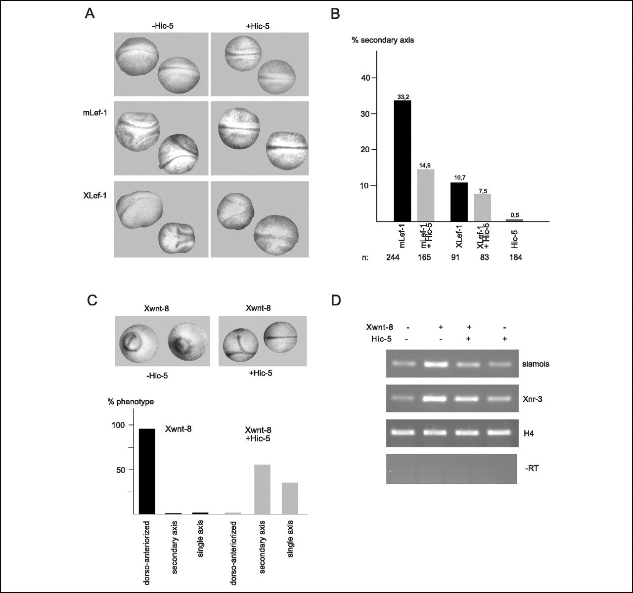 HIC-5 suppresses canonical Wnt signaling in Xenopus embryos. Both ventral blastomeres of Xenopus four-cell stage embryos were injected with 500 pg or mLEF-1, XLEF-1, or mHIC-5 mRNA or co-injected with 500 pg of mHIC-5 mRNA + 500 pg of mLEF-1 or XLEF-1 mRNA. Embryos were cultivated until the neurula stage and analyzed for secondary axis formation. A, the phenotypes of injected embryos are shown. Secondary axes induced by mLEF-1 and XLEF-1 are best seen by the appearance of a secondary neural tube. B, secondary axis formation was quantified. n, number of injected embryos. C, embryos injected with 70 pg of XWNT-8 RNA revealed complete dorso-anteriorization, which is best seen by the appearance of a ring-shaped cement gland. Co-injection of 500 pg of HIC-5 mRNA resulted in a partial rescue and the appearance of secondary axis or in a complete rescue and the appearance of a single axis. D, expression of the Wnt target genes siamois and Xnr-3 was analyzed by reverse transcription-PCR in injected and uninjected stage 10.5 Xenopus embryos. H4, amplification of the histone H4 housekeeping gene; -RT, control amplification without reverse transcription.