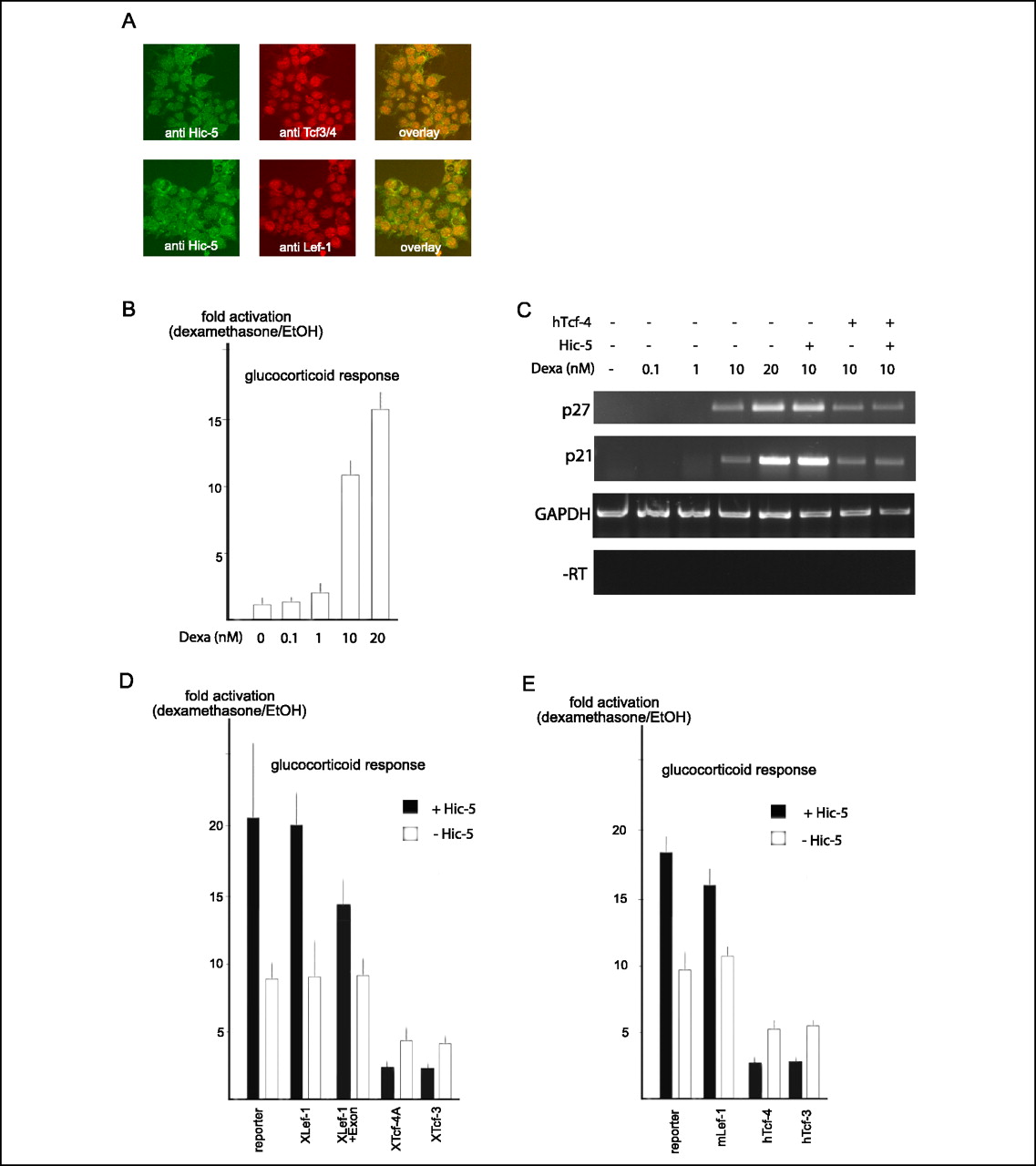 LEF/TCF proteins suppress HIC-5-induced steroid receptor activation. A, shown are the results from double staining of HeLa cells with a polyclonal antibody against HIC-5 (green) and a monoclonal antibody against TCF-3/4 or LEF-1 (red). Overlay of the HIC-5 signal with LEF/TCF signals revealed that HeLa cells contain substantial amounts of HIC-5 protein in the nucleus, where it co-localizes with LEF/TCF proteins. B, HeLa cells were cotransfected with MMTV-luciferase and CMV-β-galactosidase for normalization and treated with the indicated amounts of dexamethasone (Dexa). Each bar represents the mean value of at least seven transfections. The error bars indicate the S.E. C, reverse transcription-PCR analysis revealed that expression of the glucocorticoid receptor target genes p21cip1 and p27kip1 depends on the hormone concentration and the levels of HIC-5 and TCF. GAPDH, amplification of the housekeeping gene; -RT, control amplification of the housekeeping gene without reverse transcription. D, HeLa cells were cotransfected with MMTV-luciferase and CMV-β-galactosidase for normalization and the indicated Xenopus LEF/TCF constructs in the presence (black bars) or absence (white bars) of mHIC-5. The glucocorticoid receptor was activated by adding 10 nM dexamethasone dissolved in ethanol or by adding the solvent alone. Shown is the -fold activation by dexamethasone treatment normalized to ethanol treatment. E, the conditions were the same as described for D, but with mammalian LEF/TCF proteins. Each bar represents the mean value of at least seven transfections. The error bars indicate the S.E.