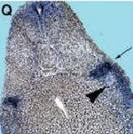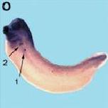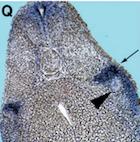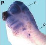 Fig. 2. Whole-mount in situ hybridization analyzes of Xpontin (AâI) and Xreptin (JâQ). (A) Xpontin expression at stage 6. (B) Xpontin expression at stage 10. (C) Section of a stage 11 embryo showing Xpontin expression in the ectoderm and the involuted mesoderm. (D) At neurula stage Xpontin is expressed in the anteriorneuroectoderm. (E) Expression of Xpontin at stage 26 in neural crest cells. (F) Staining pattern in the head of a stage 30 embryo. (G) At stage 43 Xpontin transcripts are predominantly found in esophagus (o) and proctodeum (p). (H) Section of a stage 43 embryo showing expression in the gills (g) and the esophagus (o). (I) Staining of Xpontin transcripts in isolated gastrointestinal tract of stage 48 embryo is visible in the gall bladder (gb). (J) Xreptin expression at stage 6. (K) Section of a stage 9 embryo showing Xreptin expression in the animal cap, and (L) at stage 10. (M) Expression of Xreptin in premigratory neural crest cells at stage 15. (N) Expression of Xreptin in cephalic neural crest cells at stage 26, and (O) at stage 35. Arrows 1 and 2 in (O) indicate prominent staining in the adrenal medulla (1) and in an unknown structure (2). (P) Close up of (O). Levels of sections shown in (Q,R) are given. (Q,R) Transverse sections of a stage 35 embryo. The arrow head in (Q) indicates the pronephric tubulus which is not stained, and the arrow marks staining in the adrenomedullary cells.
