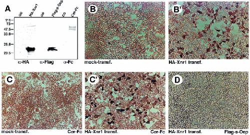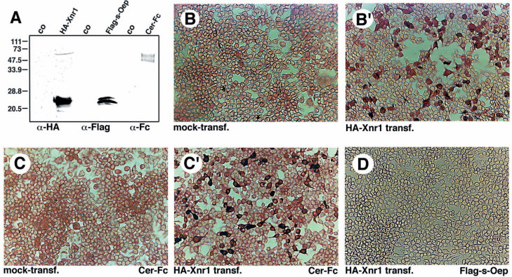Fig. 5. Soluble Oep protein does not bind to 293T cells expressing Xnr1. (A) Western blot analysis of HA-Xnr1, Flag-s-Oep and Cer-Fc proteins expressed in 293T cells. co, conditioned medium from mock-transfected 293T cells. (B) 293T cells mock-transfected or (Bâ²) transfected with pCS2+HA-Xnr1 were stained with anti-HA antibody. (C) 293T cells mock-transfected or (Câ²) transfected with pCS2+HA-Xnr1 treated with Cer-Fc-conditioned medium were stained with anti-Fc antibody. (D) pCS2+HA-Xnr1-transfected cells treated with Flag-s-Oep-conditioned medium and stained with anti-Flag antibody.