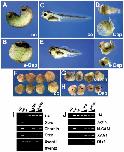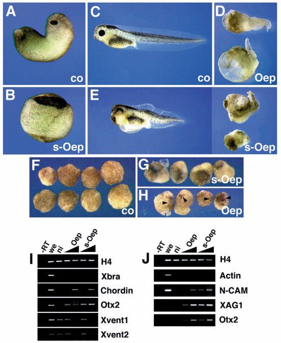 Fig. 1. Overexpression of oep leads to anteriorization and axis disruption in whole embryos and neuralization of animal caps. Embryos were injected at the 4-cell-stage into all blastomeres with 2.5 ng/blastomere control (ppl) (A,C), oep (D) or s-oep RNA (B,E). (A,B) Stage-22 embryos, ventral view, anterior to the top. (CâE) Stage-35 embryos, lateral view, anterior to the left, dorsal to the top. Note the anteriorization of s-Oep-injected embryos. (FâH) Embryos were injected animally at the 4-cell stage into all four blastomeres with 1.25 ng/blastomere control (ppl), s-oep or oep RNA. Animal caps were cut at stages 8â8.5 and cultured until control embryos reached stage 36. Note induction of cement glands by s-oep and oep (arrowheads). (I) RTâPCR analysis of animal caps. Four-cell embryos were injected animally with 0.375 or 1.25 ng/blastomere of the indicated RNAs into all four blastomeres, cut at stages 8â8.5 and cultured until control embryos reached stage 11. (J) RTâPCR analysis of animal caps. Four-cell embryos were injected and animal caps were cut as described above and cultured until control embryos reached stage 36. H4, Histone 4; âRT, negative control without reverse transcriptase; we, whole embryo positive control; ni, animal caps cut from noninjected embryos as negative control.