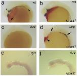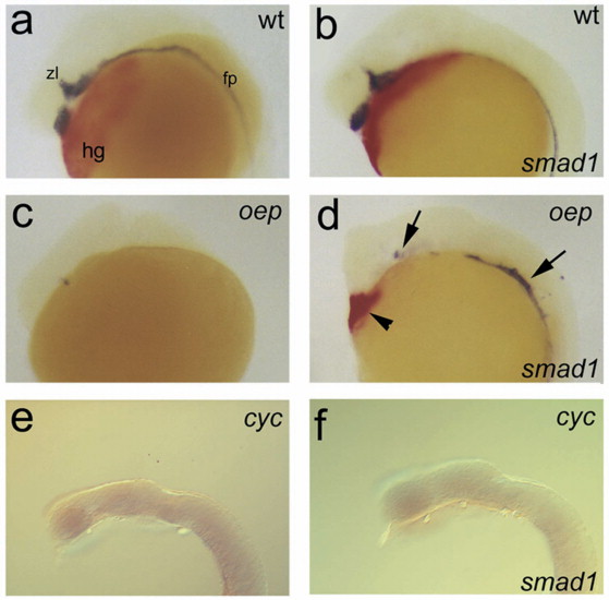 Fig. 4. Oep controls the activity of smad1 in zebrafish embryos. (A,B) Control and smad1 mRNA-injected wild-type embryos. (C,D) Control and smad1 mRNA-injected oep mutant embryos. (E,F) Control and smad1 mRNA-injected cyc mutant embryos. Embryos were hybridized to an antisense shh probe (blue/black, AâF) and an antisense hgg1 probe (red, AâD), which marks hatching gland tissue. Arrowhead and arrows point out rescued hatching glands and shh expression in smad1-injected oep mutant embryos, respectively. Embryos are 24 h old and are oriented anterior to the left and dorsal side up. The yolk was removed from the embryos in panels E,F.