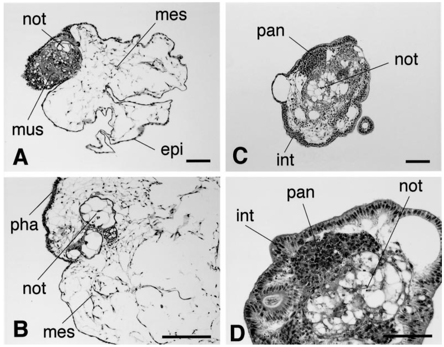 structure were differentiated. epi, epithelium; int, intestinal epithelium-like structure; mes, mesenchyme; mus, muscle; not, notochord;