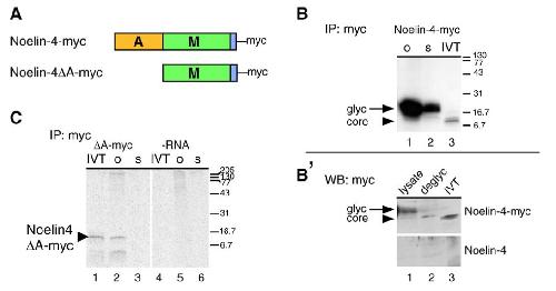 Fig. 2. Noelin-4 is a secreted, glycosylated protein. (A) Noelin constructs used in these studies are shown schematically. Noelin-4 was myc-tagged at the carboxy terminal. Noelin-4DA-myc is Noelin-4-myc with the A exon removed. (B) Noelin-4-myc was immunoprecipitated from oocyte (o, lane 1) and supernatant (s, lane 2) fractions. In vitro-translated protein (IVT) is shown in lane 3. Oocyte and supernatant fractions contain Noelin-4 protein that is larger than the size of in vitro- translated core protein. (BV) Anti-myc Western blot of embryos injected with Noelin-4-myc or Noelin-4 (for a Western blot control) as indicated. Proteins were run on SDS-PAGE either as embryo lysate (lane 1), lysate treated with PNGase F (deglyc, lane 2) or in vitro-translated protein (IVT, lane 3). Proteins in the deglycosylated sample collapsed to the size of in vitro-translated protein. (C) Noelin-4DA-myc immunoprecipitated from the oocyte fraction only, and was not found in the supernatant fraction (lane 2 versus lane 3). Control oocytes and supernatant are shown in lanes 4-6. |