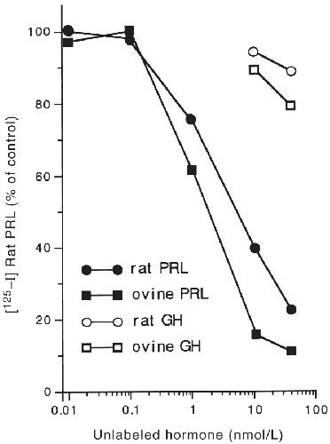 observed in the absence of competitor. (d) rat PRL; (j) ovine