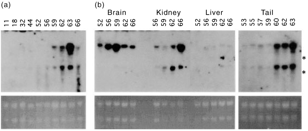 Fig. 5. Developmental changes in prolactin receptor (PRL-R) messenger ribonucleic acid (mRNA) expression in whole body (a) and in the indicated organs (b). Total RNA (each 3 μg) from the whole body and indicated organs at the indicated developmental stages were loaded on 1.2%