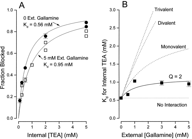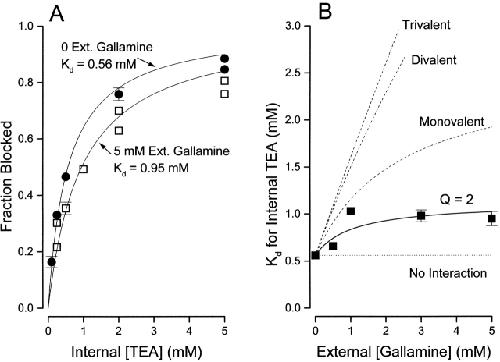 Figure 8. Interaction between external gallamine and internal TEA. (A) Block of Shaker channels (at 0 mV) by the indicated internal TEA concentrations in the absence (•) and presence (□) of 5 mM external gallamine. Lines are fits of to the data with the indicated Kd values. n = 2–5; duplicate values plotted individually, mean values (n = 3–5) with SEM limits only if larger than symbols. (B) Ordinate is the apparent dissociation constant for block by internal TEA at the indicated concentrations of external gallamine. Error limits illustrated (when larger than symbol) are the estimated errors from the fitting routine (see methods). Solid line is the best fit of to the data with a Q value of 2.0. The dashed lines illustrate the predicted effects of an external trivalent, divalent, and monovalent antagonist (see text for details). |