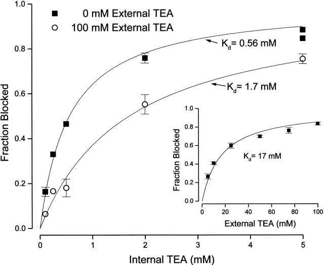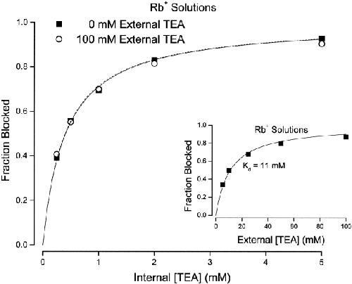 Figure 5. Channel block by internal TEA in the absence and presence of external TEA in Rb+ solutions. Fraction block of Shaker channel current by the indicated internal TEA concentrations in the absence (▪) and presence (○) of 100 mM external TEA. Currents measured at 0 mV. (Dotted line) Fit of to the data in the absence of external TEA with a Kd value of 0.4 mM. (Solid line) Fit of to the data in the presence of 100 mM external TEA with a Kd value of 0.41 mM. Mean values of three to four measurements. All standard error limits were smaller than the symbols. (Inset) Channel block by external TEA in the presence of Rb+ ions. Block of Shaker current at a potential of 0 mV at the indicated concentrations of external TEA. Mean values from three to four measurements. All standard error limits were smaller than the symbols. (Line) Best fit of to the data with the indicated dissociation constant. |